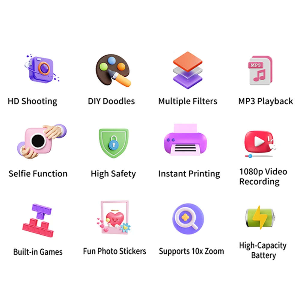 1. Instant Print Camera: The kids mini instant print camera doubles as a digital camera and an instant photo printer. With a simple press of the shutter, children can capture their favorite moments. Another press of the print button instantly generates a black-and-white photo from the camera body, allowing kids to use colored pencils to DIY their photos and unleash their creativity.